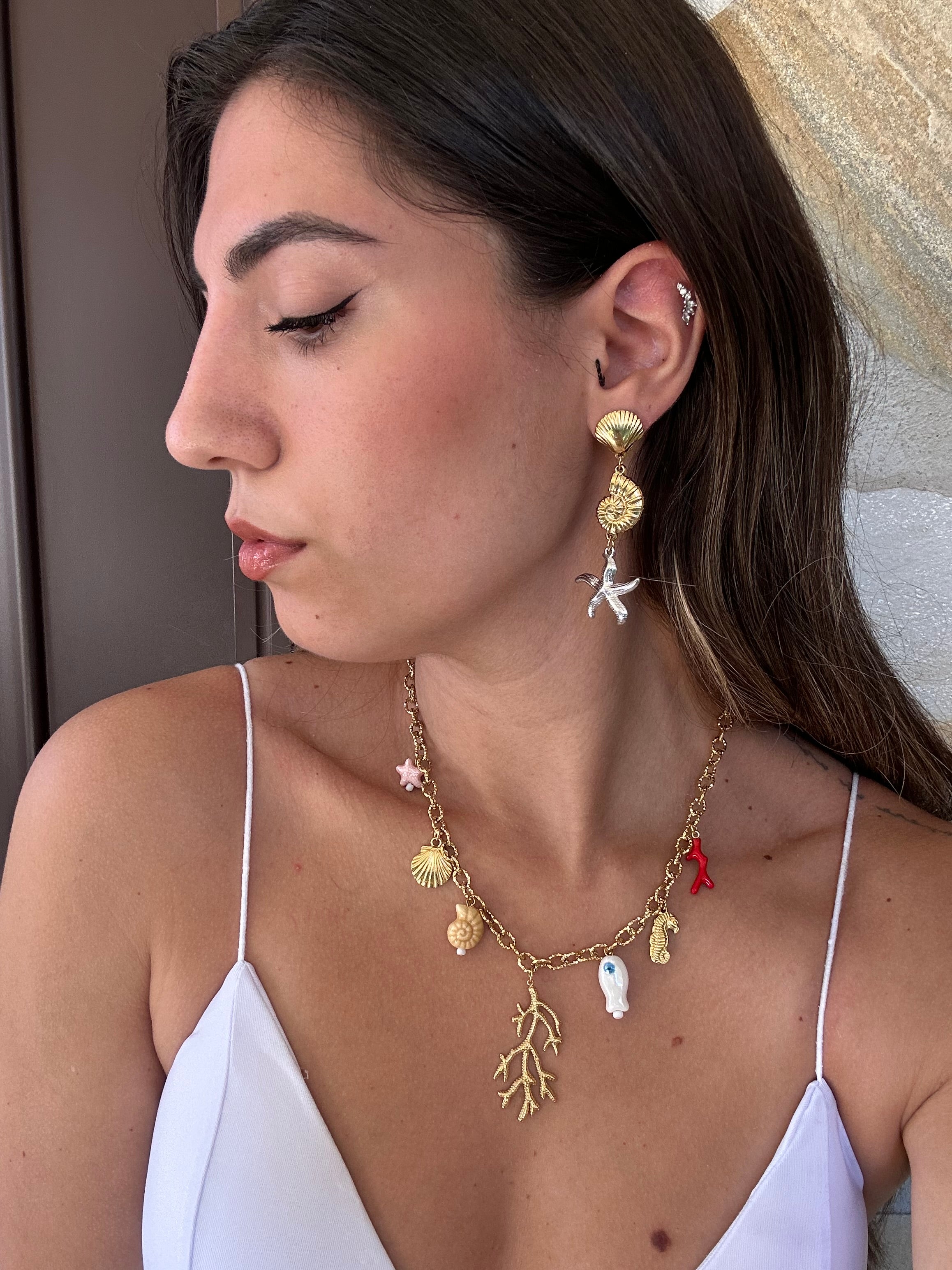 Questa collana dorata con conchiglie è un accessorio estivo perfetto: leggera, luminosa e ispirata al mare. Elegante e ricca di dettagli come stelle marine, perle e cristalli, dona un tocco prezioso e chic a qualsiasi look, rendendolo speciale tutto l’anno.