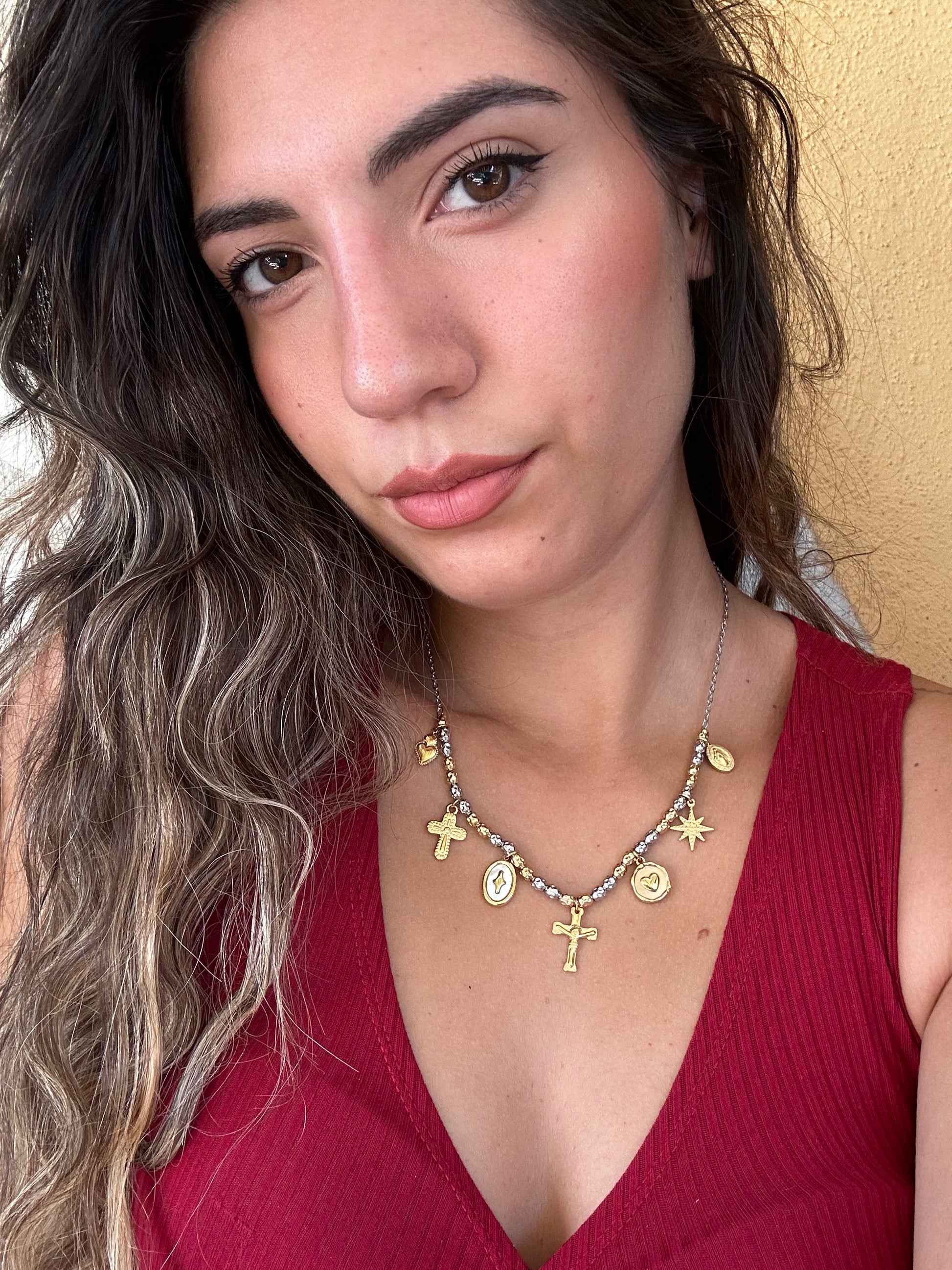 Collana in acciaio inossidabile con sfere in Gold e silver e pendenti con croci, madonnina, cuore e stella